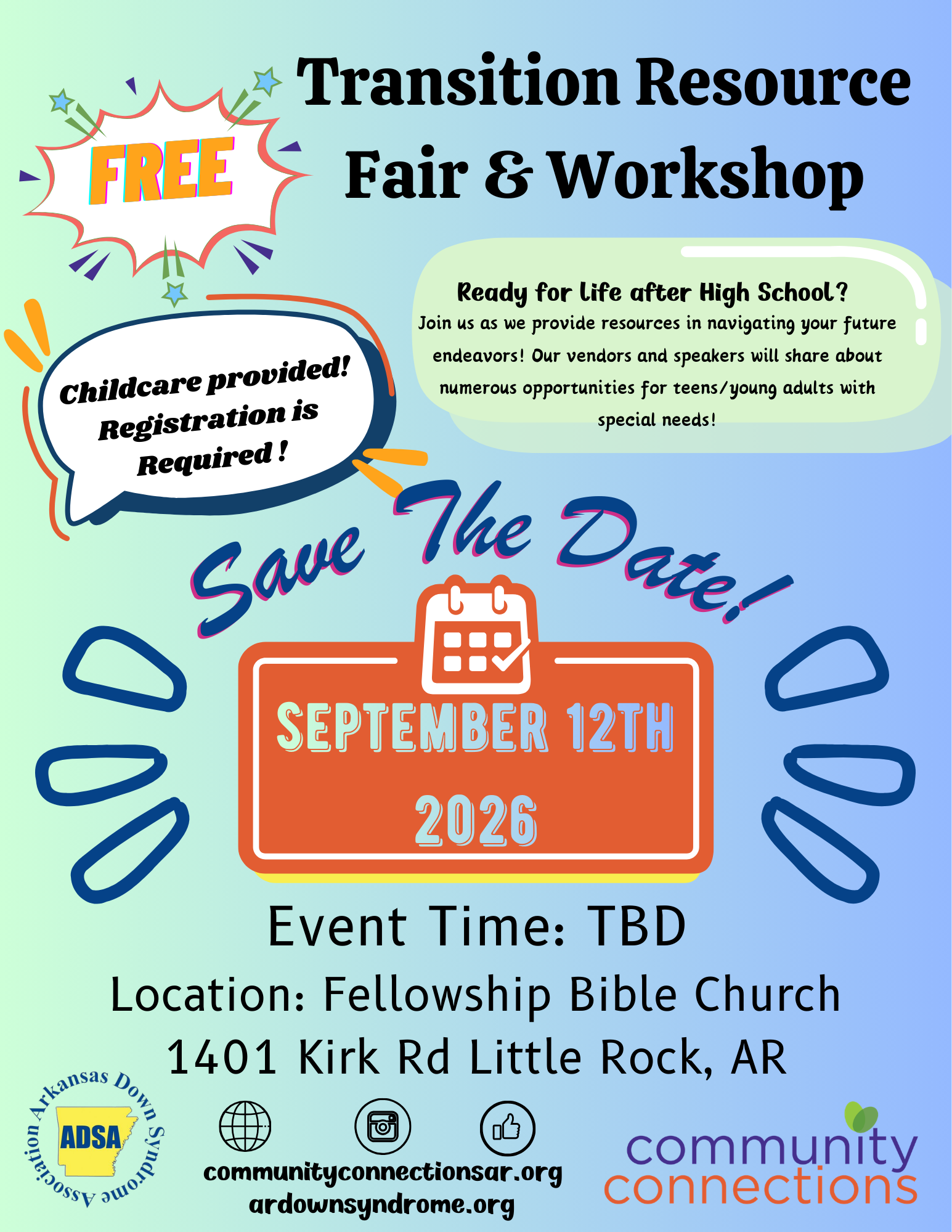 Community Connections and the Arkansas Down Syndrome Association is hosting a FREE Transition Fair & Educational Workshop for families of children/teens/young adults with special needs. Free childcare for children, teens/young adults will also be available! Community Connections will provide oversight of children’s activities/childcare. Childcare will close out at the end of the workshop. Registration is required with or without the need for childcare. Click on the link below to secure your spot today!